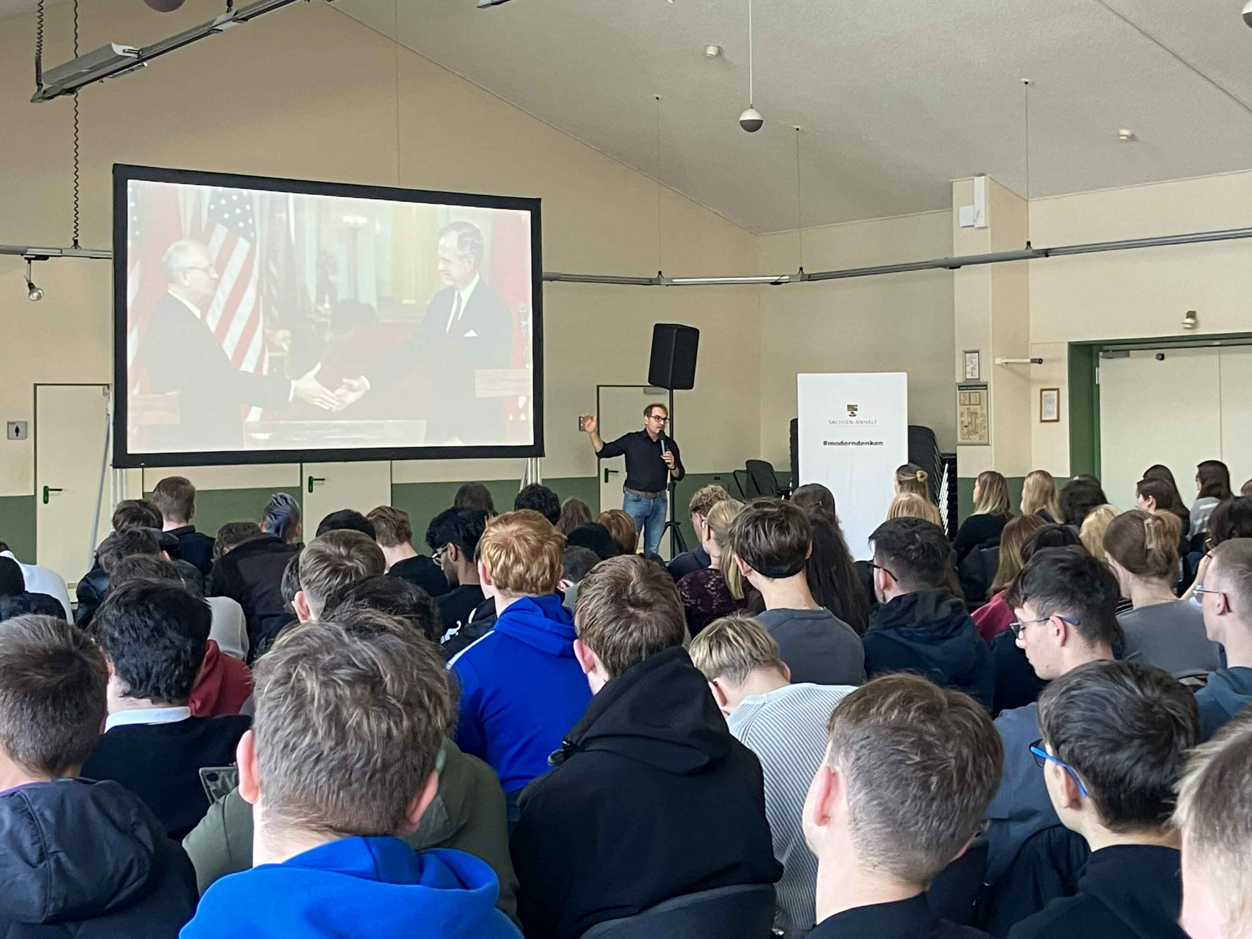 Am 6. November 2025 nahm der Politologe, Journalist und Produzent Ingo Espenschied aus Mainz rund 300 Schülerinnen und Schüler des BSZ Stendal im Foyer der Mehrzweckhalle mit auf eine multimediale Reise durch die Geschichte Deutschlands und Europas. Zu der Bildungsveranstaltung eingeladen hatte die Staatskanzlei und Ministerium für Kultur des Landes Sachsen-Anhalt. Nach einleitenden Worten von Schulleiter Jens Schößler und Isabell Rohde, Referentin EU-Angelegenheiten, führte Ingo Espenschied zunächst Klassen des Beruflichen Gymnasiums durch seine DOKULIVE-Präsentation „Deutschland in Europa – Die Deutsche Einheit“. In rund anderthalb Stunden blickte er gemeinsam mit ihnen zurück auf die Teilung Deutschlands nach 1945 bis hin zur Wiedervereinigung – und wie diese gelingen konnte. Dabei verband er historische Fakten mit multimedialen Inhalten. Im Anschluss an den Vortrag folgte eine Diskussions- und Fragerunde, in der die Jugendlichen Fragen stellen konnten. Darunter: „Wie lange machen Sie diese Präsentationen schon?“, „Gab es in der DDR Migration?“ oder „Wenn man über die Mauer wollte, wurde man dann sofort erschossen?“. Der zweite Durchgang des Tages, an dem Schülerinnen und Schüler der Fachschule, Berufsfachschule und Berufsschule teilnahmen, behandelte das Thema „75 Jahre Europa“.