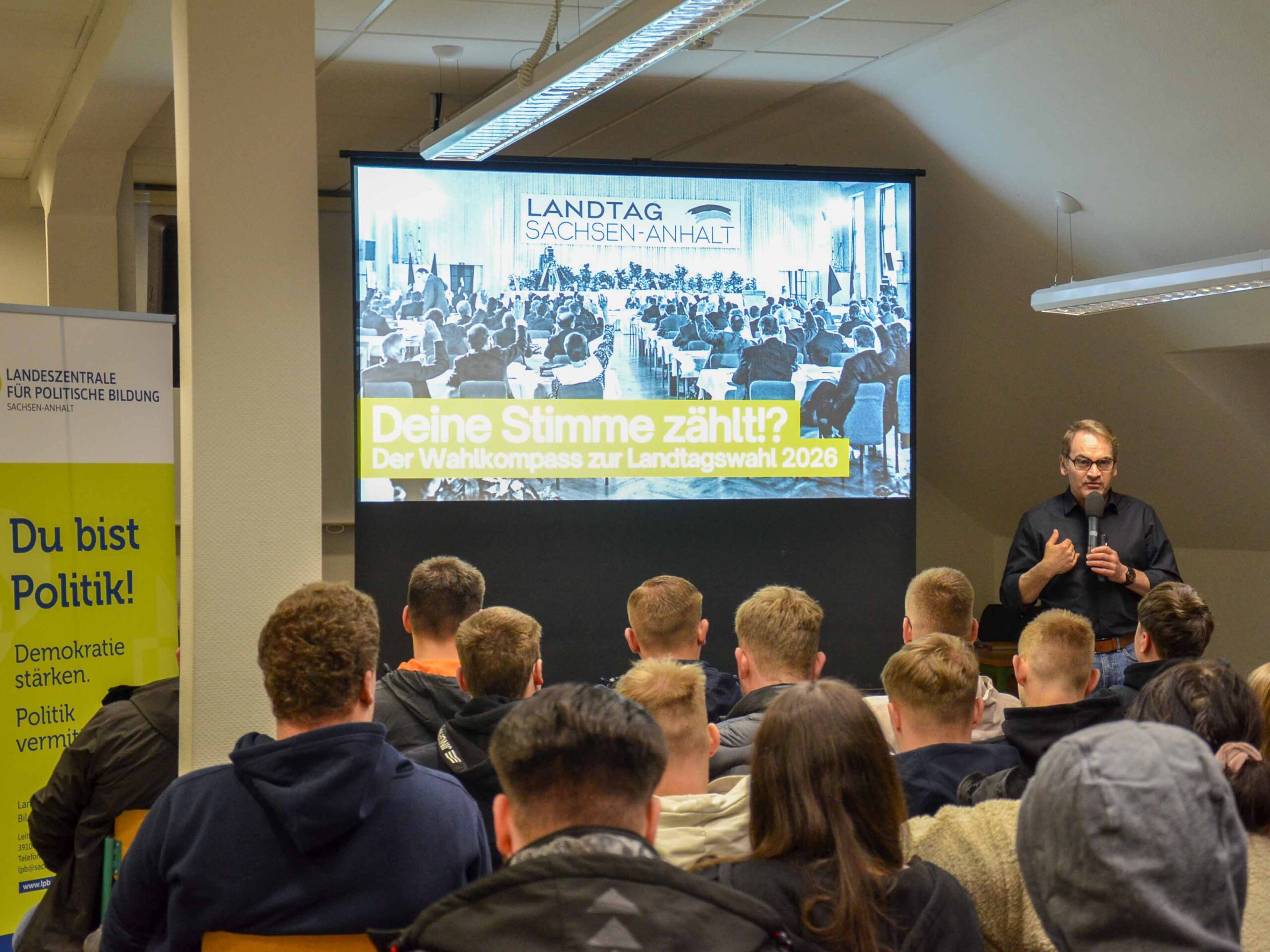 Mit Fragen wie „Wie funktioniert Demokratie?“ und „Ist die eigene Wahlstimme wichtig?“ beschäftigte sich die Veranstaltung „DOKULIVE – Deine Stimme zählt!?“ am 26. März 2026 im Haus 1. Im Hinblick auf die Landtagswahl in Sachsen-Anhalt am 6. September 2026 nahm der Politologe, Journalist und Produzent Ingo Espenschied Schülerinnen und Schüler mit auf eine multimediale Reise durch das Bundesland und seine Geschichte. Insgesamt zehn Klassen verschiedener Schulformen nahmen an dem Event teil, das in zwei Durchgänge aufgeteilt war und jeweils rund 90 Minuten dauerte. Erreicht werden sollten insbesondere Jugendliche, die bei der kommenden Wahl erstmals ihre Stimme abgeben dürfen. Von den laut Ingo Espenschied insgesamt rund 1,7 Millionen Wahlberechtigten in Sachsen-Anhalt gehören etwa 50.000 zur Gruppe der Erstwählerinnen und Erstwähler.